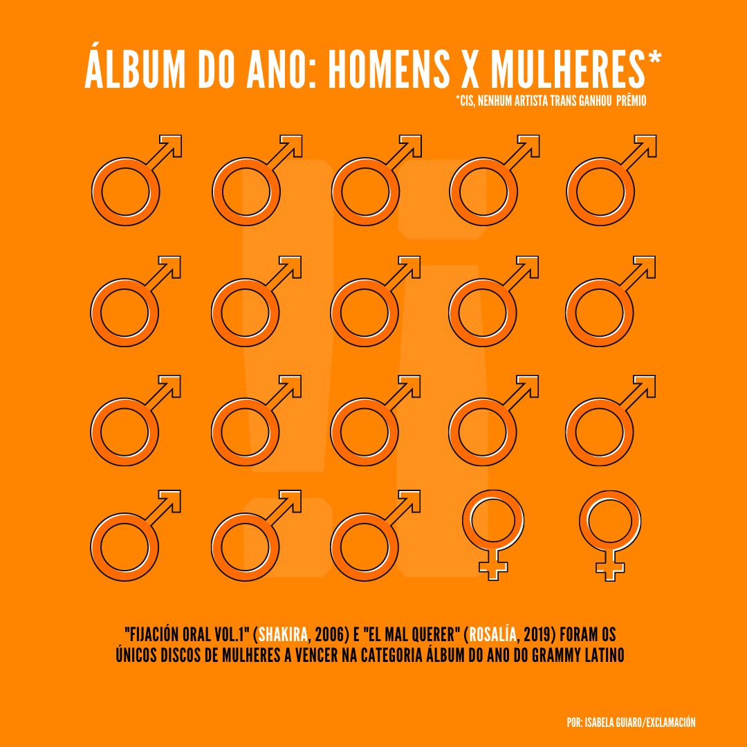 Olhando por cima os nomes dos principais vencedores, há algo que chama atenção: a maioria deles são homens. E a diferença não é pouca: a categoria mais importante da noite, Álbum do Ano, conta com 18 vitórias de homens e duas de mulheres. As únicas vencedoras foram Shakira com “Fijación Oral Vol. 1”, em 2006, e Rosalía com “El Mal Querer”, em 2019.