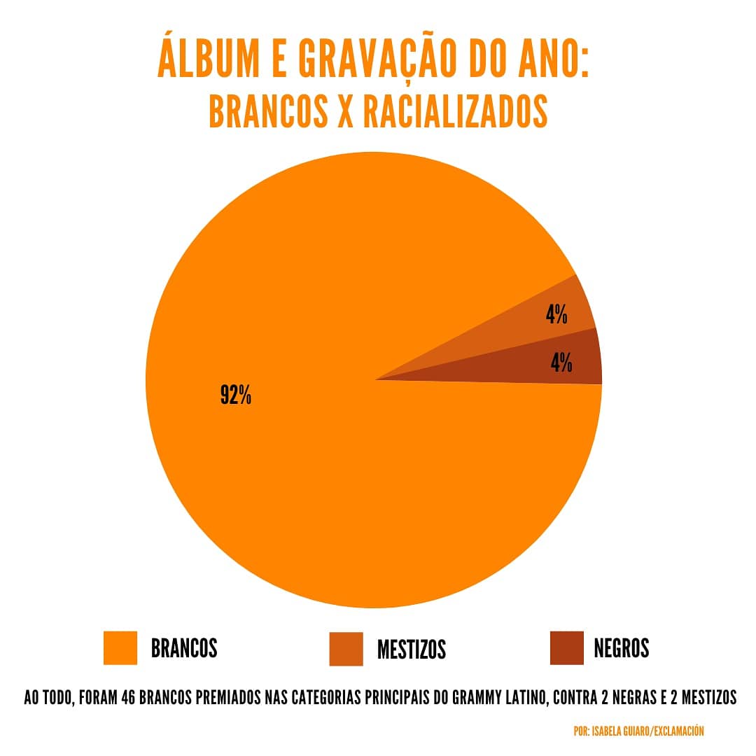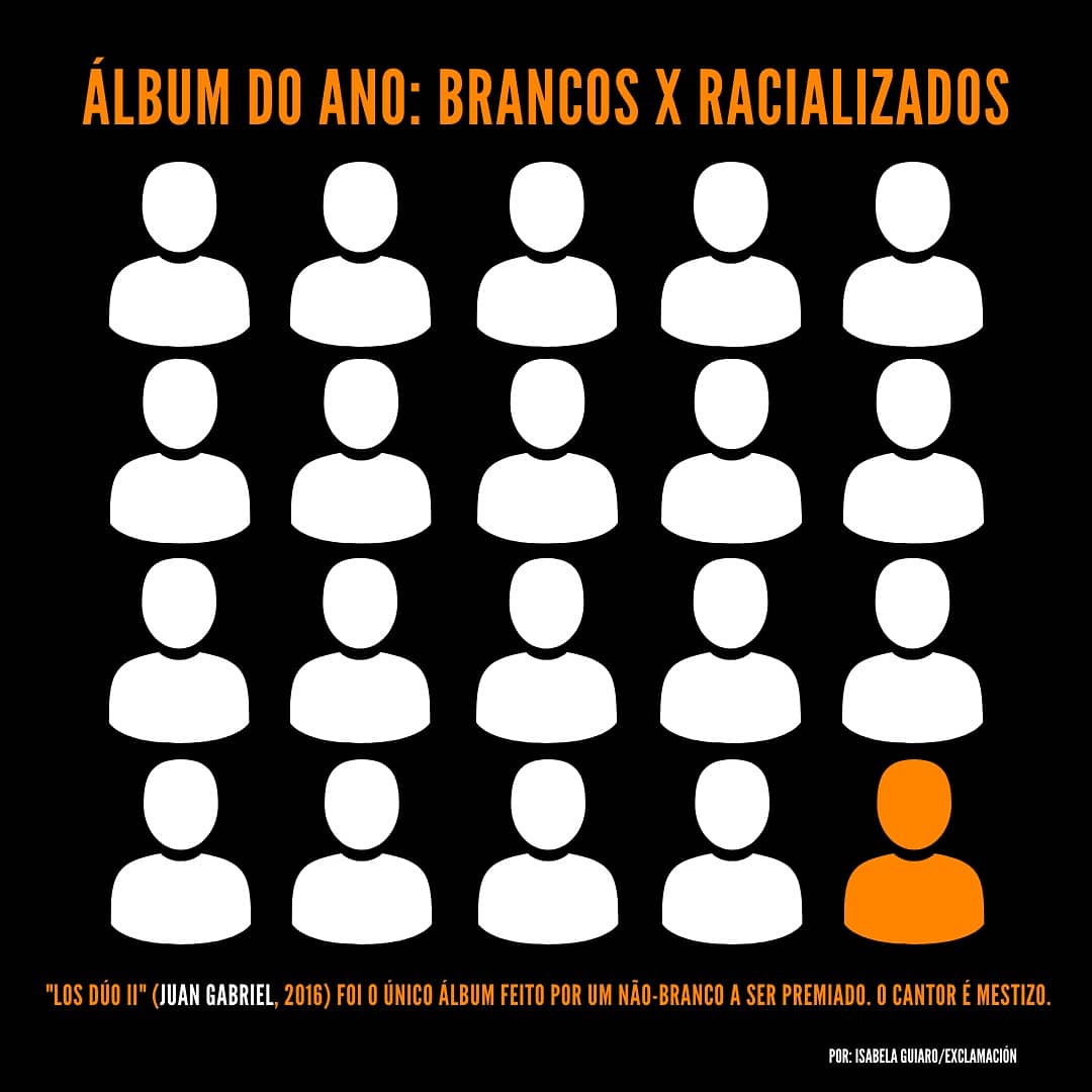 A divisão racial é ainda mais forte em relação à de gênero. O único álbum de um artista não-branco a ganhar foi “Los Dúos II”, de Juan Gabriel. O cantor é um mexicano mestizo e o prêmio foi dado postumamente, em 2016.