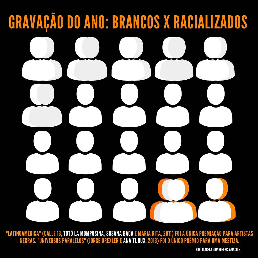 Na Gravação do Ano, o mesmo segue: as únicas artistas não-brancas foram as já mencionadas Susana Baca (peruana) e Totó La Momposina (colombiana), ambas negras, e a chilena mestiza Ana Tijoux.