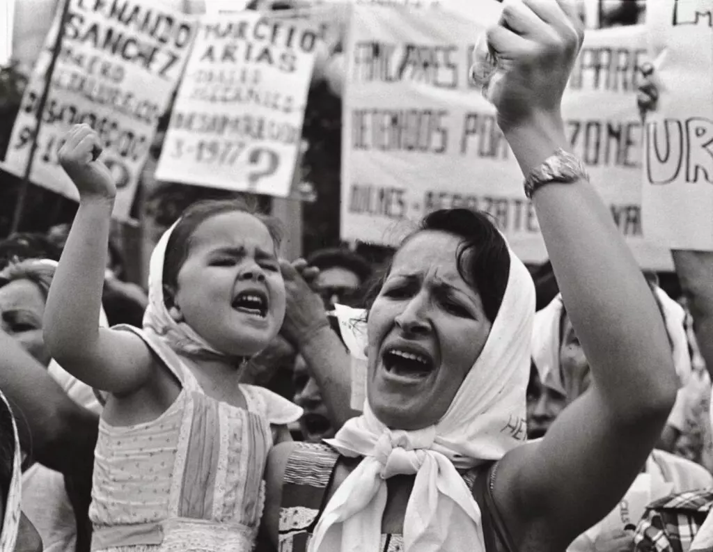 Nasce, em 1977, o movimento das Madres de Plaza de Mayo, tornando regular os encontros de ainda mais mulheres na região, em forma de oposição e em busca de justiça. Com o símbolo de um lenço branco na cabeça, as Mães da Praça de Maio se tornam o primeiro movimento contra o militarismo durante a ditadura.