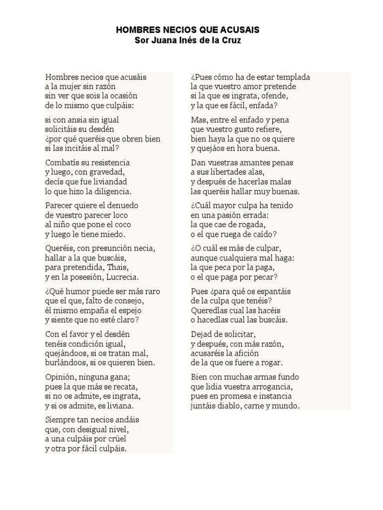 Além disso, um de seus poemas mais famosos, “Hombres necios que acusáis”, é um exemplo contundente de sua postura crítica. Nele, Sor Juana denuncia a hipocrisia dos homens que condenam as mulheres por comportamentos que eles mesmos incentivam. Sua escrita ácida e irônica revelava uma consciência feminista avant la lettre, contestando os papéis de gênero e a opressão feminina em um contexto altamente repressivo.